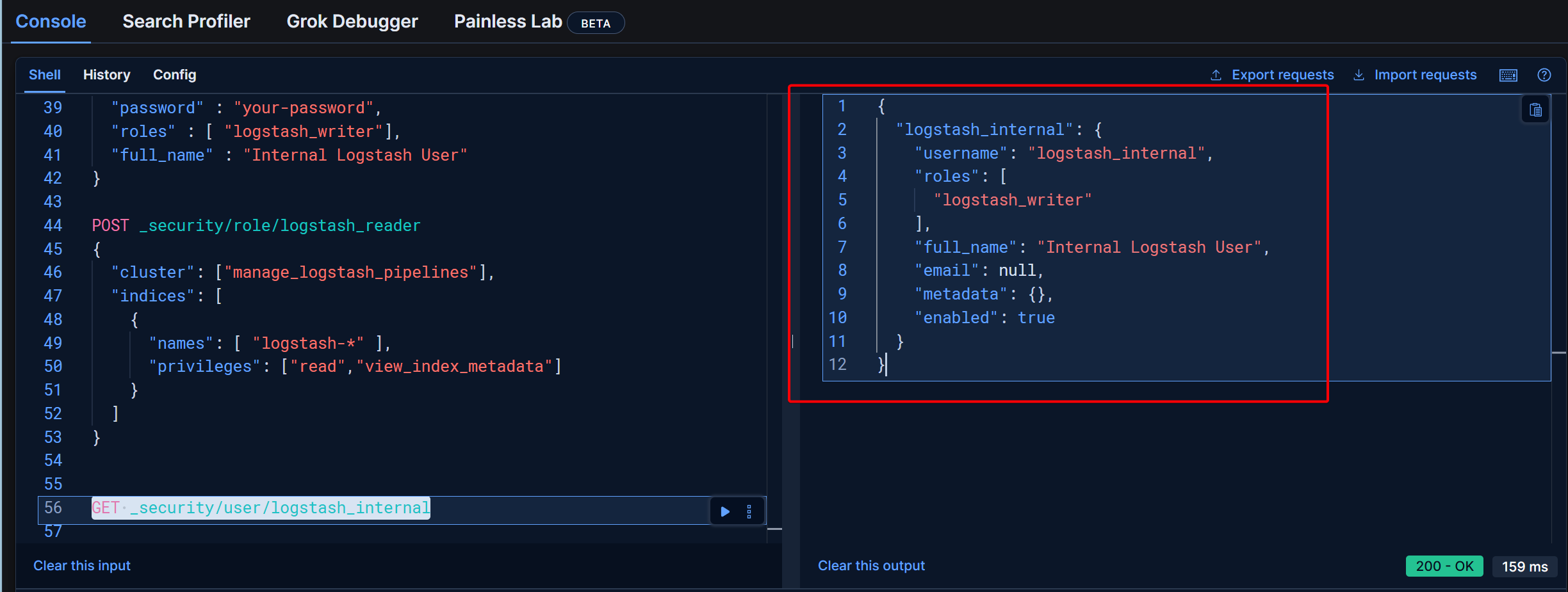 이후 logstash_internal 에 role이 잘 부여되었는지 보기 위해 아래 GET 명령을 실행합니다.